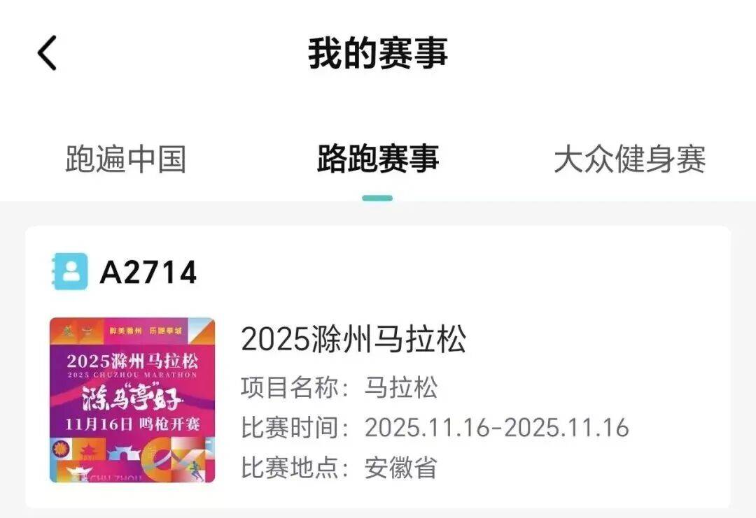 2.点击“路跑赛事”,在报名列表中找到“2025滁州马拉松”即可查看“参赛号”。