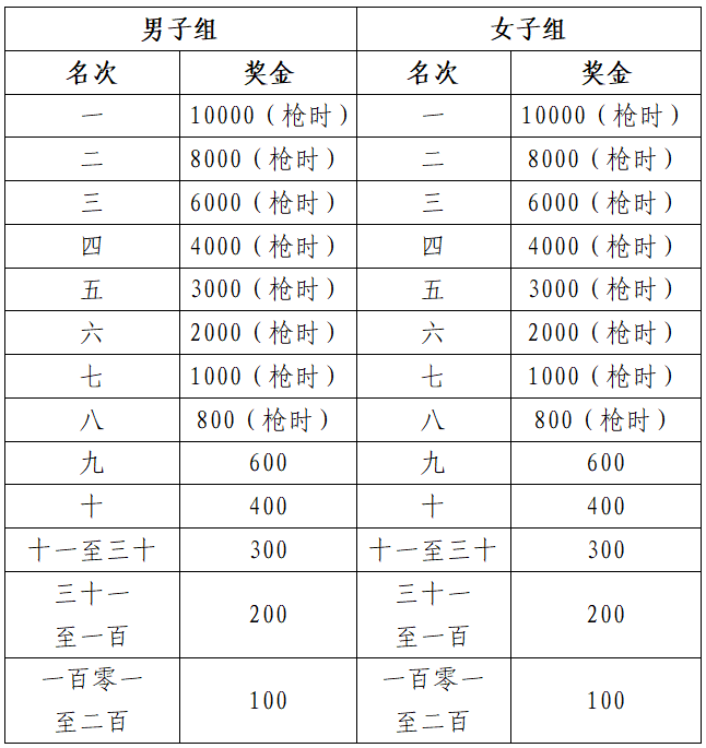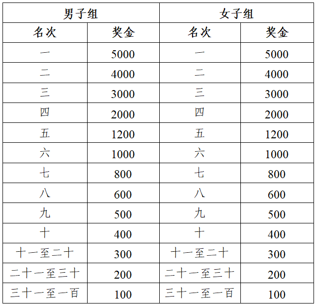 男、女分别录取前200名(前8名选手以枪声计时有效成绩录取,第9-200名按净计时有效成绩录取),分别获得奖金,见下表(单位:人民币/元)。