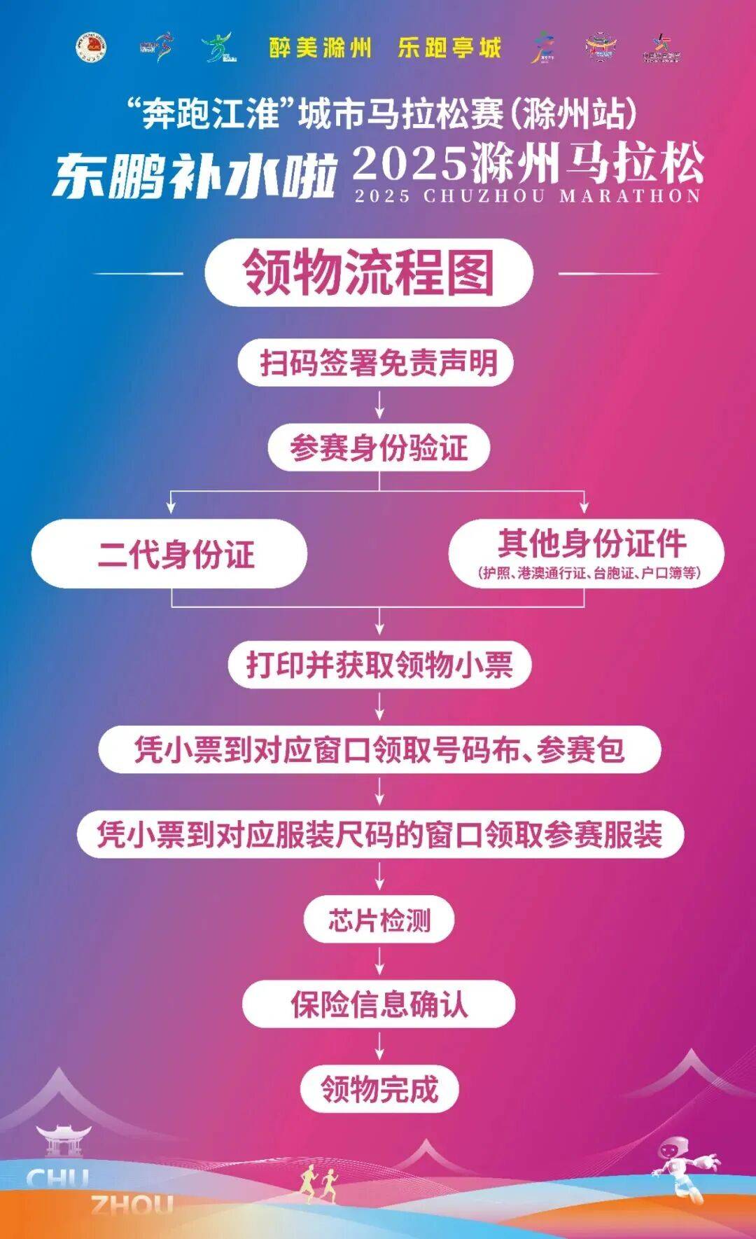 扫码签署免责声明→出示身份证件打印领物小票→凭小票到对应窗口领取号码布、参赛包→凭小票到对应服装尺码的窗口领取参赛服→芯片检测→保险信息确认→领物完成。