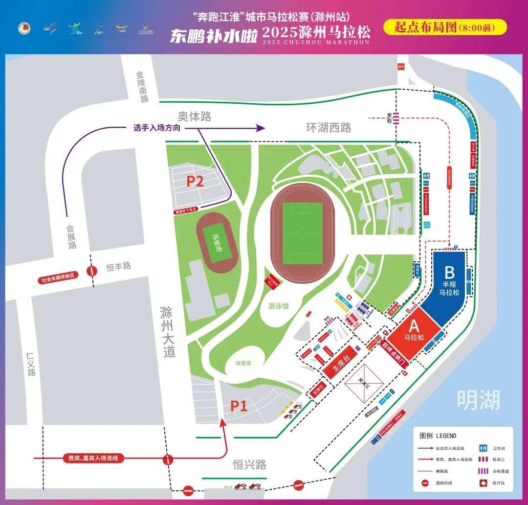 本次比赛按马拉松、半程马拉松项目的顺序分区检录集结,各项目间距10米。非竞速轮椅选手须在大众选手分区站位最尾端出发。