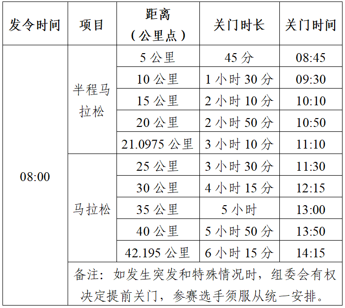 为了保证参赛选手比赛安全,对社会交通进行限时滚动封闭。比赛路线各段专设了赛事关门时间,到了关门时间,相应公里点的计时地毯停止工作,相应路段将恢复社会交通。在规定关门时间内,未跑完对应距离的参赛选手须立即停止比赛,退出赛道,以免发生危险。退出比赛的选手等候组委会提供的收容车或选乘公共交通抵达终点。