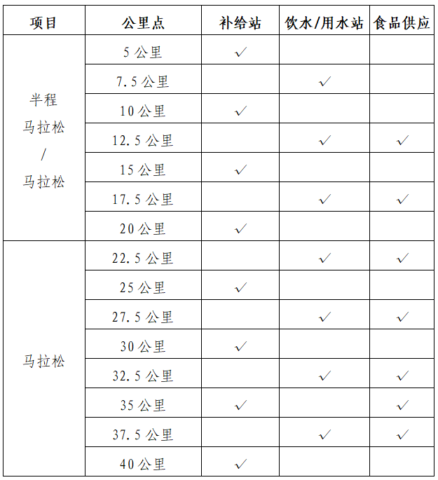 2.食品供应:12.5公里、17.5公里、22.5公里、27.5公里、32.5公里、35公里、37.5公里、半程马拉松终点和马拉松终点。