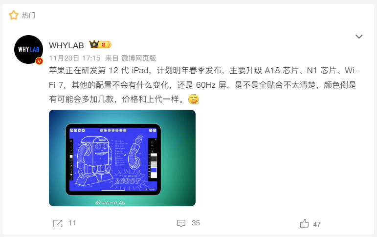 总的来说,第 12 代 iPad 的爆料完全超出预期,A18 芯片 + 8GB 内存 + AI+Wi-Fi 7 的组合,再加上不变的亲民价格,堪称 “性价比之王”。如果外观和续航能保持前代的水准,上市后大概率会成为爆款。对于不需要 Pro 级功能的用户来说,这款平板几乎找不到短板,闭眼冲都不亏。
