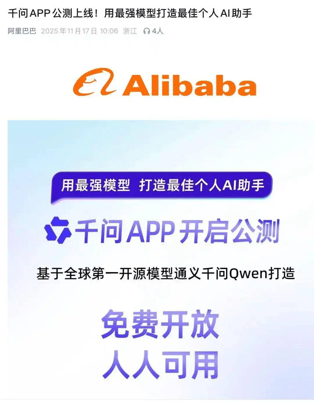 11月17日,阿里正式官宣:个人AI助手千问APP开启公测。根据官方介绍,这一应用基于全球第一开源模型通义千问Qwen打造,免费开放,人人可用。
