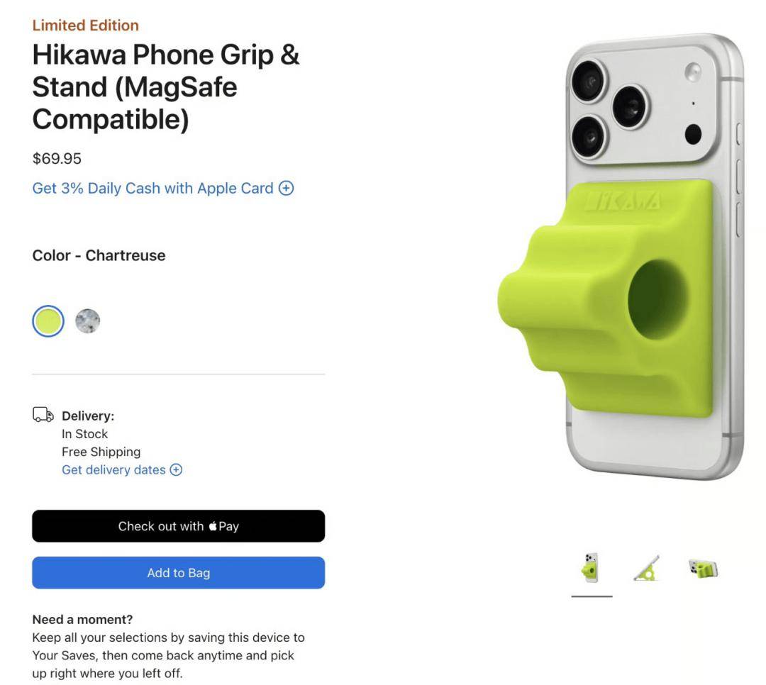 Hikawa目前已上架苹果官网,售价69.95美元(约500元人民币)。设计师Hikawa表示,该产品源于广泛的用户访谈,特别考虑到手部灵活性有限或无法正常操作iPhone的群体需求。