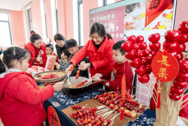 浙江省湖州市长兴县雉城街道大西门社区寒假公益托班,“共享奶奶”周仙花与辖区小朋友一起制作冰糖葫芦。通讯员谭云俸 摄