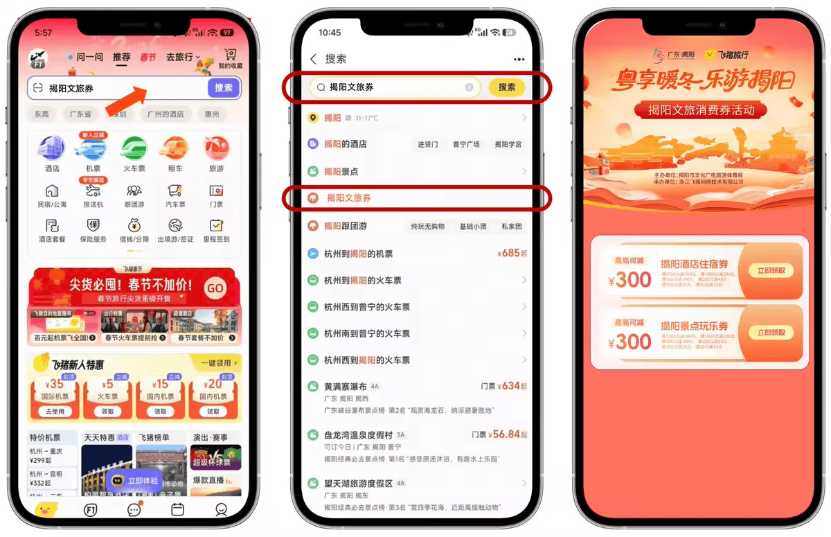 领取方式:公众可通过携程APP或小程序,搜索“揭阳文旅消费券”“揭阳消费券”等关键词进入活动页面,也可通过平台信息流等广告位,进入线上发券页面领取消费券。