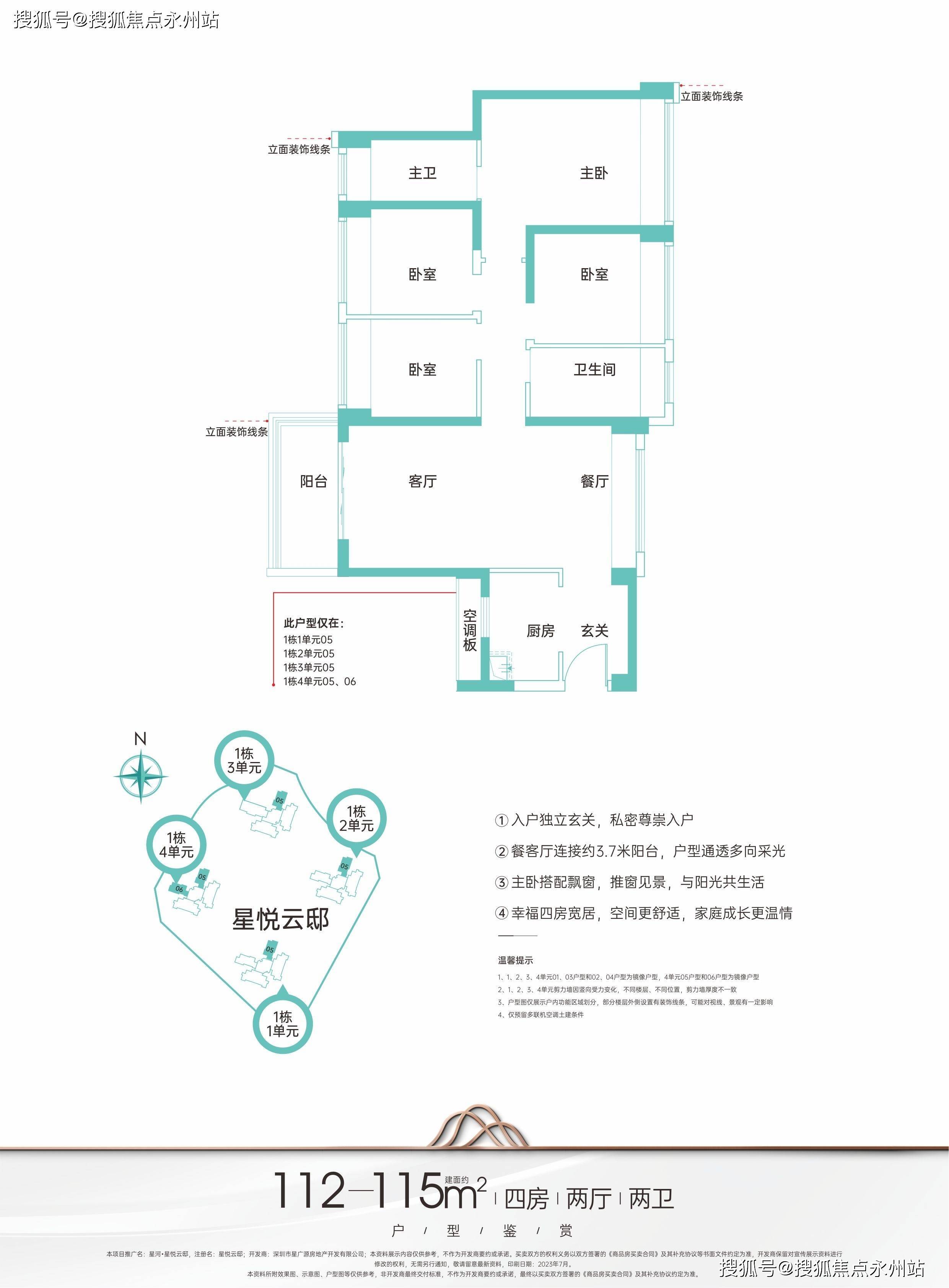 建面约112-115㎡户型:则为户型方正、动静科学分区的四房两卫设计,更能满足多人口家庭的全周期居住需求。